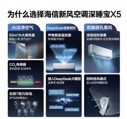 智能交互方面,海信深睡宝X5搭载Deepseek语音智控技术,支持1句话多意图响应,比如用户下达“海信小聚,我热了,调一下空调,开启新风,不要直吹我”等复合指令,海信新风空调深睡宝X5便能同时响应并调整到对应模式。与此同时,还支持6种方言识别,5米内声源定位可一键开启防直吹模式,操作便捷省心。