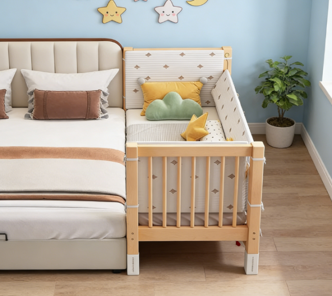 核心设计:支持多档位高度调节与多种模式切换,可独立使用、拼接大床、折叠移动,还能变身游戏床、书桌等,延长使用周期;内置五感安抚系统与仿生护脊技术,模拟母体环境,助力宝宝深度安睡;开箱即用无异味,无需额外通风。